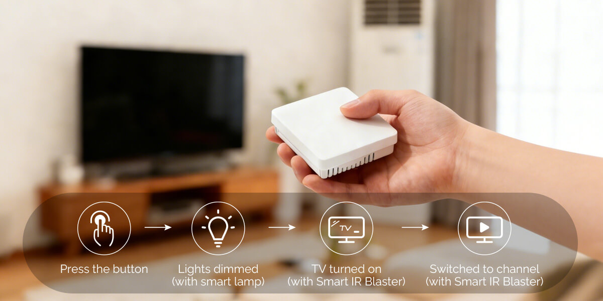 Transform your living room into a theater with a single click. Just press the smart button to instantly dim the lights, power on the TV, and switch directly to your favorite channel via the Smart IR Blaster. No fumbling with remotes—just sit back and enjoy the show.