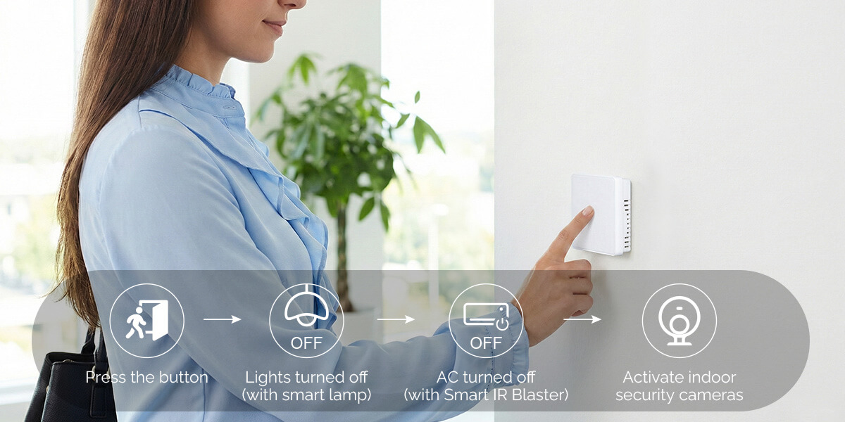 Streamline your morning exit. Instead of running around to check every room, just press the button by the door. Instantly turn off all lights and the AC to prevent energy waste, and automatically enable your security cameras. Leave home in seconds, not minutes.