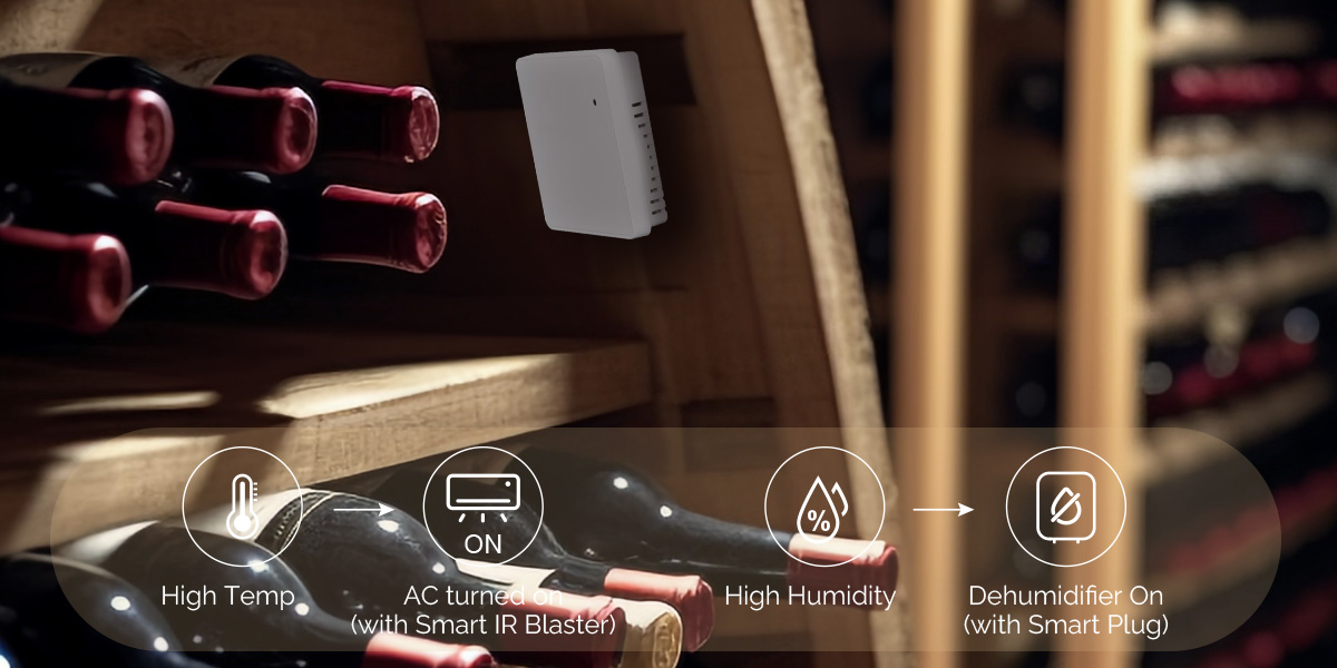 Don't let fluctuating conditions ruin your collection. Whether for a wine cellar or cigar humidor, this sensor ensures stability. It triggers the cooling unit immediately if temperatures rise above the ideal range and powers on the dehumidifier to prevent mold-causing moisture, keeping your assets safe.