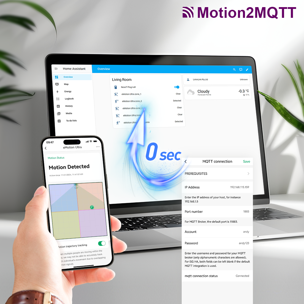 SEAMLESS HOME ASSISTANT INTEGRATION - eMotion series devices work entirely locally after setup. Built-in MQTT support allows for instant integration with Home Assistant and other third-party platforms. Enjoy real-time zone updates and ultra-fast, local automations—plus full compatibility with Alexa, Google Assistant, and Siri.