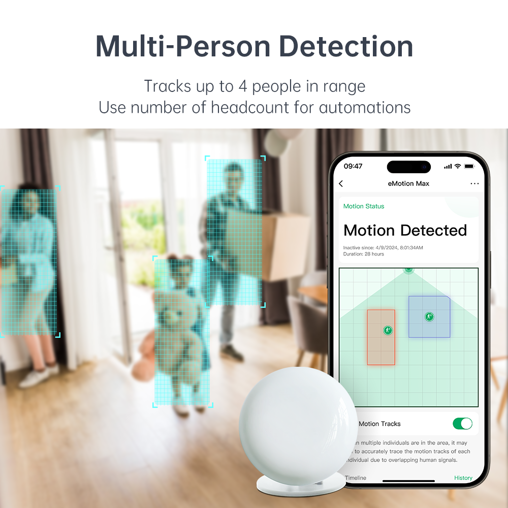 MULTI-PERSON COUNTING & LIVE TRACKING - No cameras. No privacy concerns. eMotion Max detects and tracks up to 4 people in real-time, identifying their locations within the detection range. Ideal for hotels or Airbnb hosts to monitor and limit guest numbers without compromising privacy.
