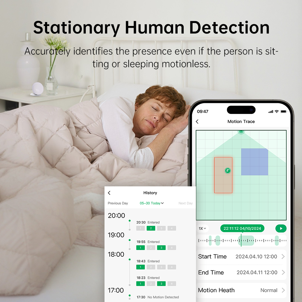 MULTI-ZONE POSITIONING & SMART AUTOMATIONS - No need for multiple sensors! With up to 4 customizable detection zones (e.g., sofa, bed, desk), simply tap and draw on a 100-grid map within the app. Set personalized automation rules for each zone with precision and ease.