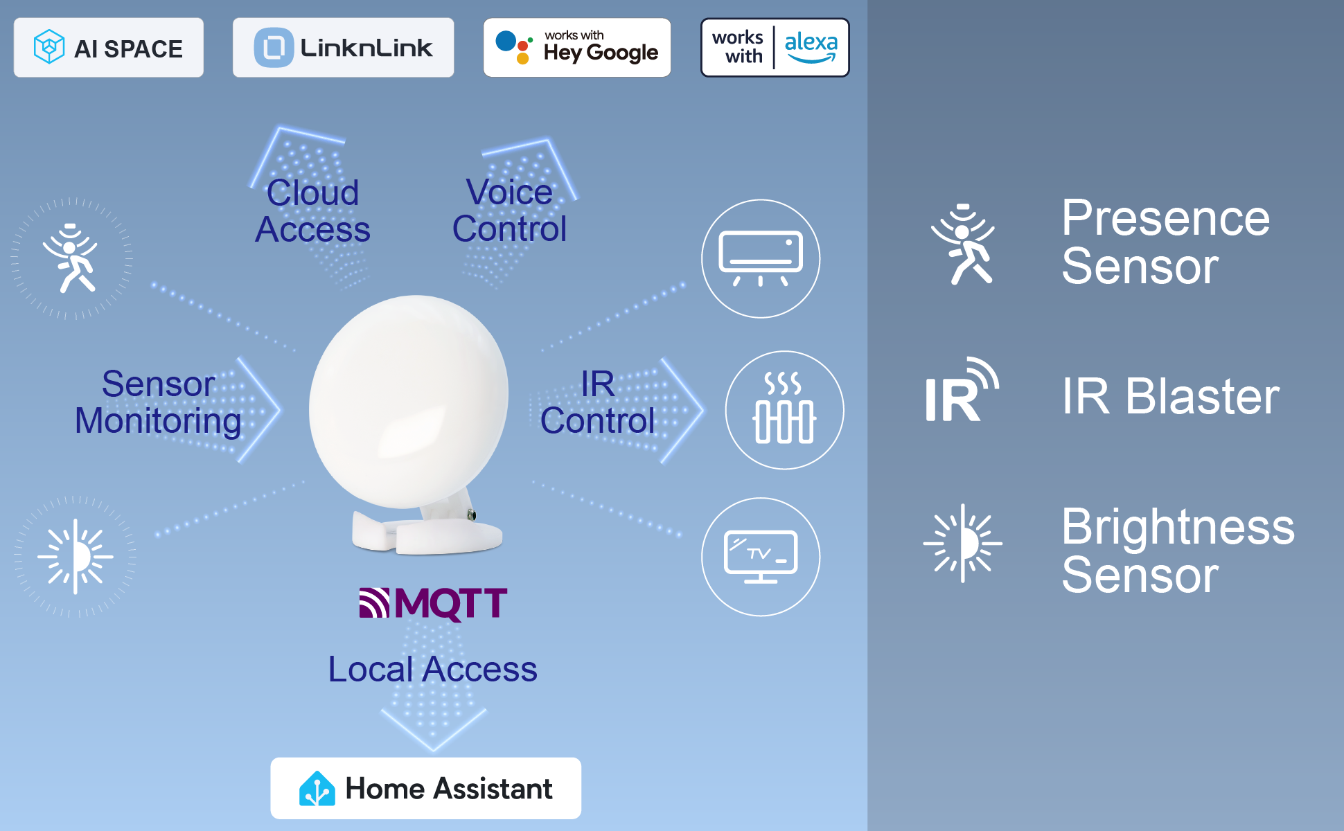 Built-in 360° IR blaster controls TVs/ACs/audio (15m range). Built-in light sensor detects brightness in real-time and works with presence detection to automate lighting when the room is dark and occupied.