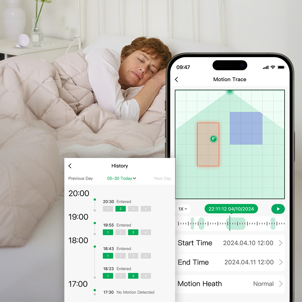 ADVANCED ELDERLY CARE MONITORING - Support independent living with smart elderly care. eMotion Max detects unusual inactivity and triggers alerts if no movement is sensed within a set time. It also syncs live positions to the cloud and uses AI to analyze movement patterns, helping assess well-being and provide families with timely care insights.