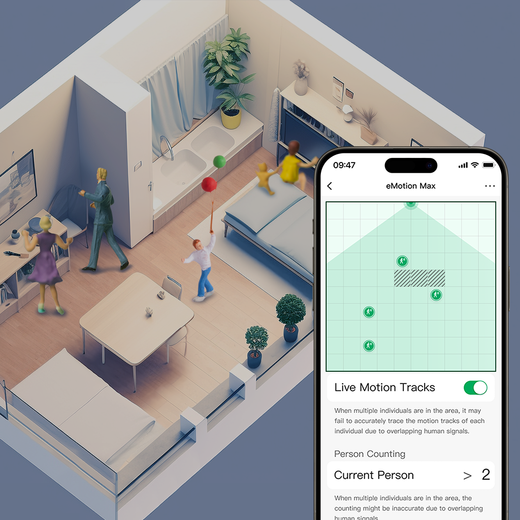 SUPERIOR ANTI-INTERFERENCE ACCURACY - eMotion Max intelligently filters out non-human movement in 3D space. Define interference zones in the app to exclude items like plants, curtains, or pets, and set a filtering height to ignore fan movement or crawling pets—ensuring accurate human presence detection every time. Note: eMotion Max requires a certified 5V/2A power adapter. Please refer to the “Installation Guide” in the app for setup instructions.