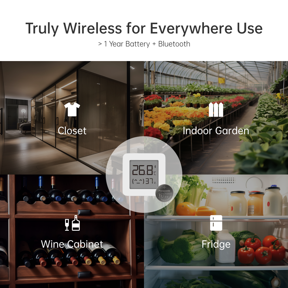 BLE connected to eRemote for viewing instant data remotely, 24H data graph and super long 3-year history downloads. CR2032 battery life at least 1 year. No cable needed.