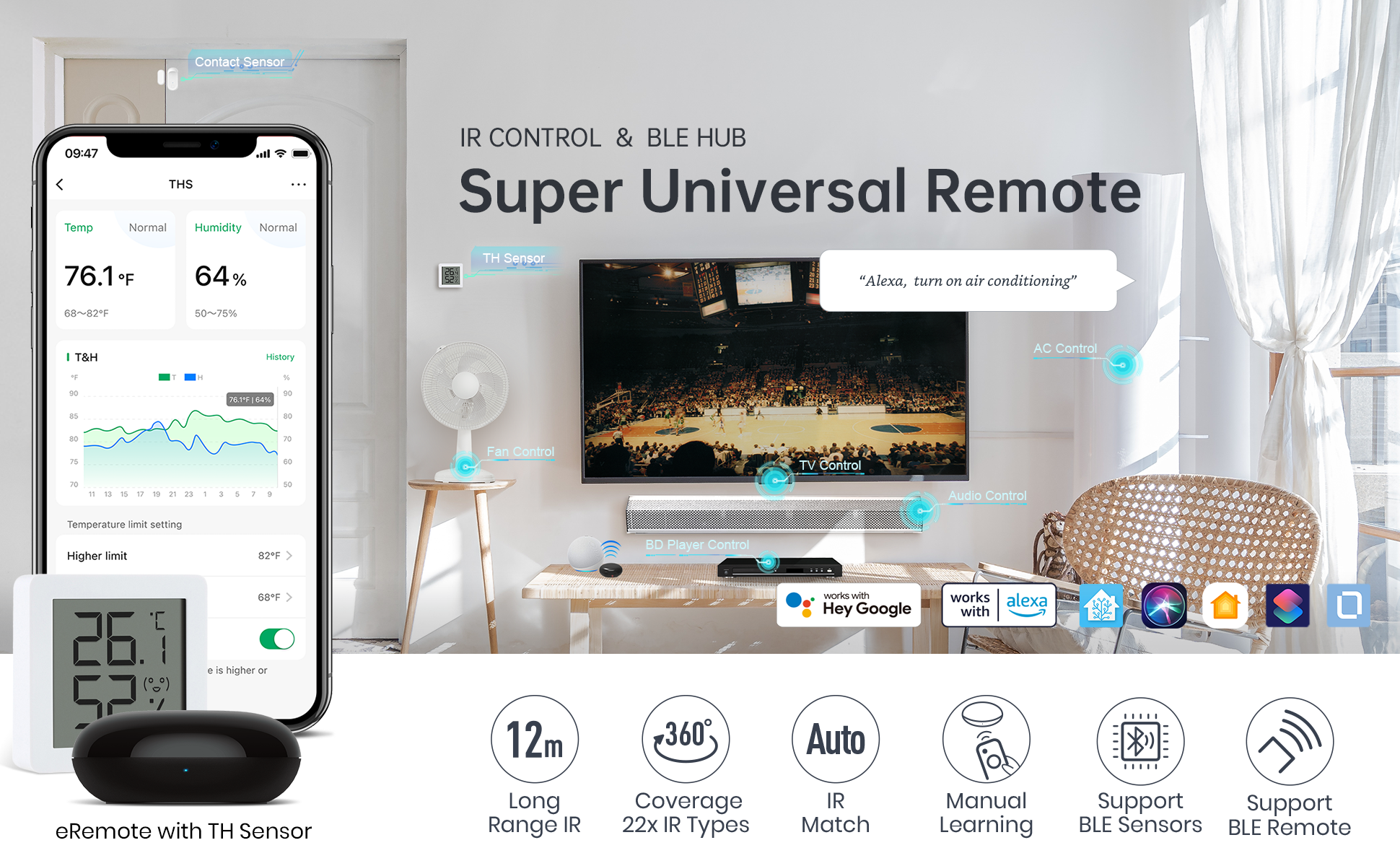Smart WiFi Universal Remote: IR Blaster for TV, Aircon, STB, Featuring Bluetooth BLE Smart Home Hub, Compatible with Alexa, Google Home