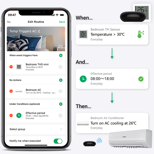 Just ask Alexa or Google Assistant the temperature or humidity data in specific room. Use Routines in Alexa App as an event to interact with products from other brands (ex. Turn on Tuya smart plug with heater if temperature is lower than 10℃/50℉).