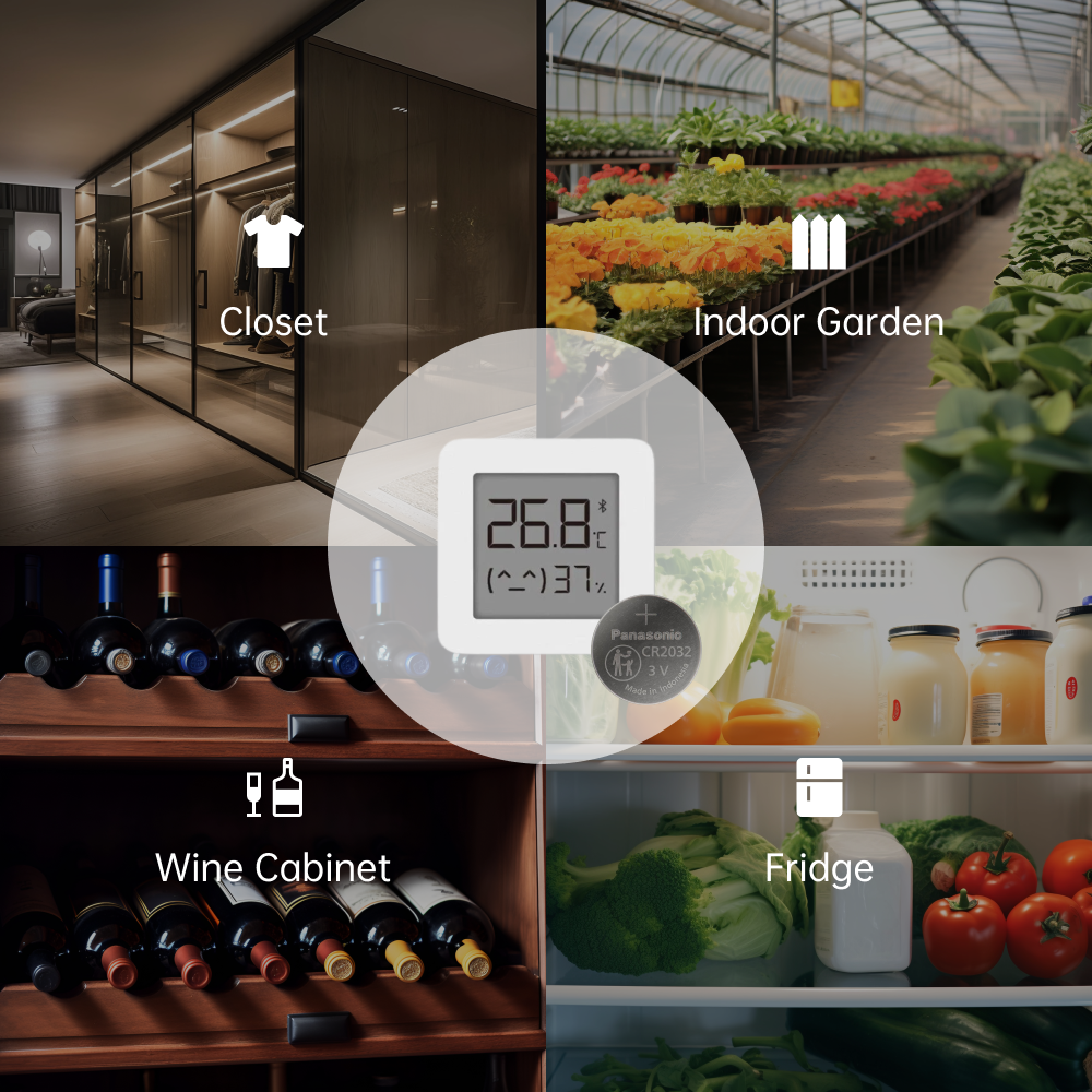 BLE connected to eRemote for viewing instant data remotely, 24H data graph and super long 3-year history downloads. CR2032 battery life at least 1 year. No cable needed.