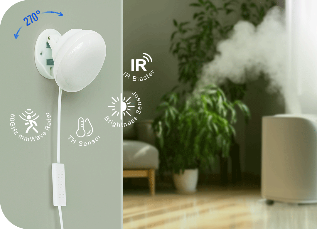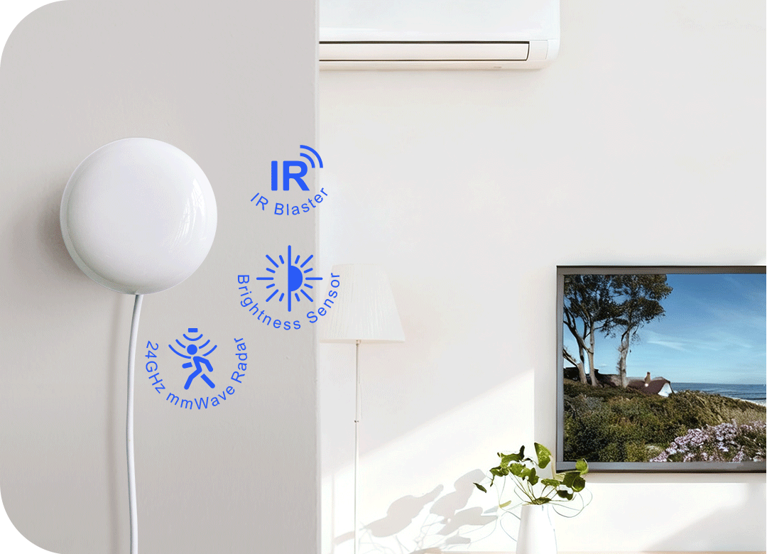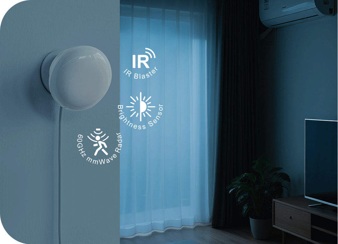 Senses where others can't. Powered by 3rd-Gen 24GHz mmWave technology, it delivers reliable presence detection even through obstacles. Install it inside a cupboard or hide it behind decor for Invisible Sensing. Includes IR blaster to turn dumb appliances smart.